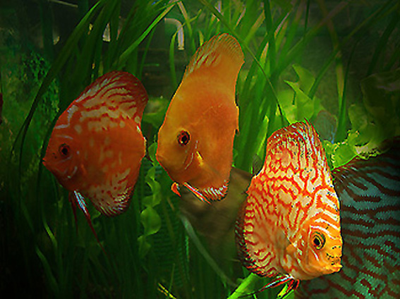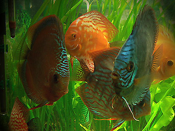 Der erste Blick auf Diskusfische im Gesellschaftsaquarium lässt nicht erkennen, dass diese besondere Ansprüche stellen. Anspruchsvoll sind sie auch nur bedingt, vorausgesetzt man leitet den technischen Aufwand für ein solches Aquarium von vorneherein in die richtigen Wege. Um den Diskusfischen optimale Lebensbedingungen bieten zu können, sind zwar einige gezielte Maßnahmen erforderlich, der technische Aufwand, den man betreiben muss, hält sich jedoch in erträglichen Grenzen. Diskusfische können recht groß werden, so dass man für die Haltung eines erwachsenen Tieres mit ca. 50 Liter Wasser rechnen muss. Das Wasser muss einen hohen Sauerstoffgehalt aufweisen. Um eine durchgehende Sauerstoffzufuhr zu gewährleisten, ich habe mein Diskusaquarium mit zwei Filtern bestückt, an beiden Filtern ist noch jeweils ein Difffusor angebracht, so gefiltert reicht die Sauerstoffzufuhr fast immer aus. Die zwei Filter haben in einem Gesellschaftsaquarium unterschiedliche Aufgaben. Einer davon ist ein Schnellfilter. Der zweite Filter hat eine wesentlich komplizierte Aufgabe. Er soll die Wasserqualität verbessern. Von Kot und Urin sowie nicht verzehrte Futterreste und abgestorbene Pflanzenteile wird das Wasser stark belastet und machen dieses mit der Zeit für die Fische lebensunfreundlich. Anfallenden Nitrat kann man am einfachsten durch regelmäßigen Teilwasserwechsel unter Kontrolle halten. Will man also der Wasserqualität der Fische im natürlichen Lebensraum möglichst nahe kommen, muss man das Lebenselement der Fische so giftfrei wie möglich halten. Meine Fische halte ich bei einer Wassertemperatur von 26° - 27°. Die Beleuchtung in meinen Diskusaquarium habe ich auf vier Stück T5 (2 Stück Arcadia Plant Pro/ 2 Stück Arcadia Marine Wheit) Röhren bei 10 Stunden Brenndauer ausgelegt. Der pH-Wert gibt den Gehalt an Säure oder Base wieder. Liegt der pH-Wert bei 7, ist das Wasser neutral. Das Ionenverhältnis ist ausgeglichen. Liegt er darunter, so ist das Wasser mehr oder weniger sauer. Liegt der pH-Wert oberhalb der Neutralgrenze von 7, ist das Wasser basisch. Diskusfische sind, bedingt durch die Durchmischung ihrer Naturbiotope mit Schwarzwasser, an ein Leben in saurem Wasser gewöhnt. Steigt der pH-Wert über die Neutralgrenze, so zeigen die Diskus durch Dunkelfärbung Unwohlsein an. Der erweiterte Fischbesatz sollte den einem Diskusbecken angepasst sein, ich pflege in meinem Becken noch den Neonsalmler Paracheirodon den Schmucksalmler Hyphessobrycon ornatus, Sternflecksalmler Pristella riddlei, Dornaugen Acanthophtalmus semicintus sowie noch einige kleine Welsarten der Familie Corydoras. Das Futter der Diskusfische sollte recht Abwechslungsreich sei: Morgens erhalten meine Tiere Diskusgranulat und auch Flockenfutter Mittags gebe ich selbst gemachtes Rinderherz, Abends gibt es weiße oder rote Mückenlarven auch gefrorene Salinenkrebse gibt es noch zur Abwechslung.